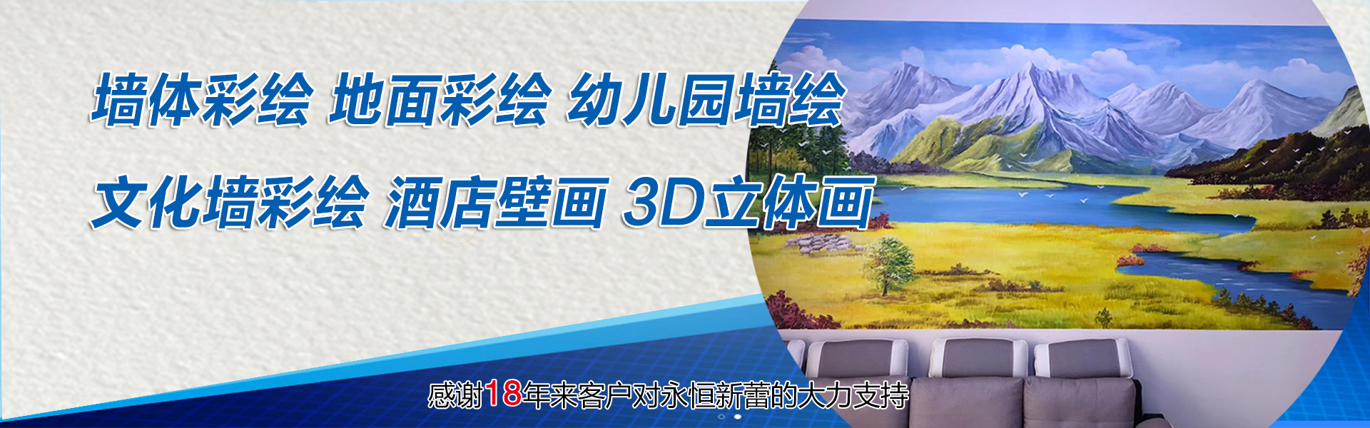 北京永恒新蕾廣告有限公司是一家專業(yè)從事大型墻體彩繪、文化墻、地面彩繪、手繪壁畫的設計、繪制、施工的專業(yè)綜合藝術服務單位。主要承接各類大型寺廟空間;文化展覽展示空間;餐飲、娛樂、家居、公共場所空間的彩繪美化展示等業(yè)務。